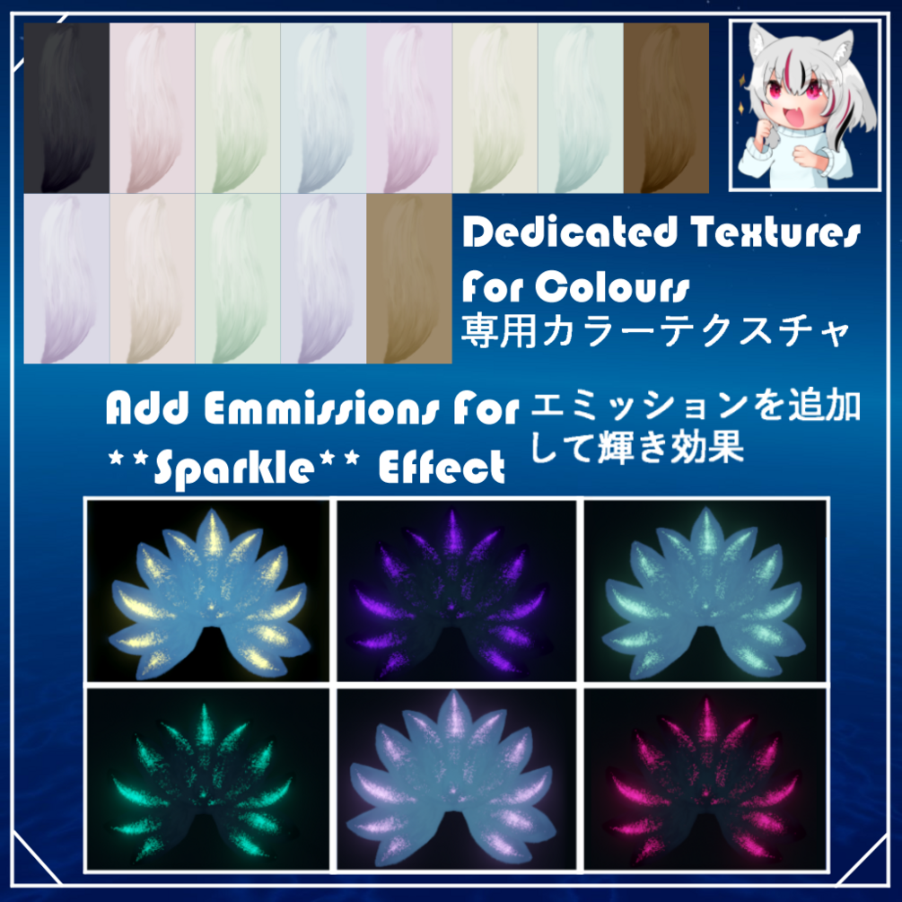 このモデルは、以下にある私の11テイルスモデルを改良したもので、メッシュやシェーダーの変更など、クオリティを犠牲にした大幅なパフォーマンスアップグレードが施されています。オリジナルのしっぽの機能に大きな変更はありません。